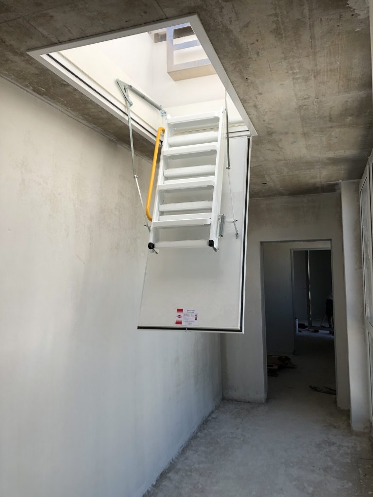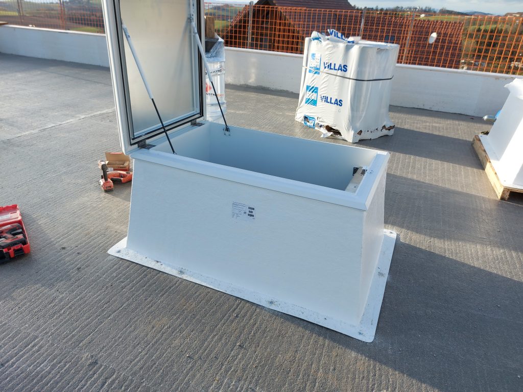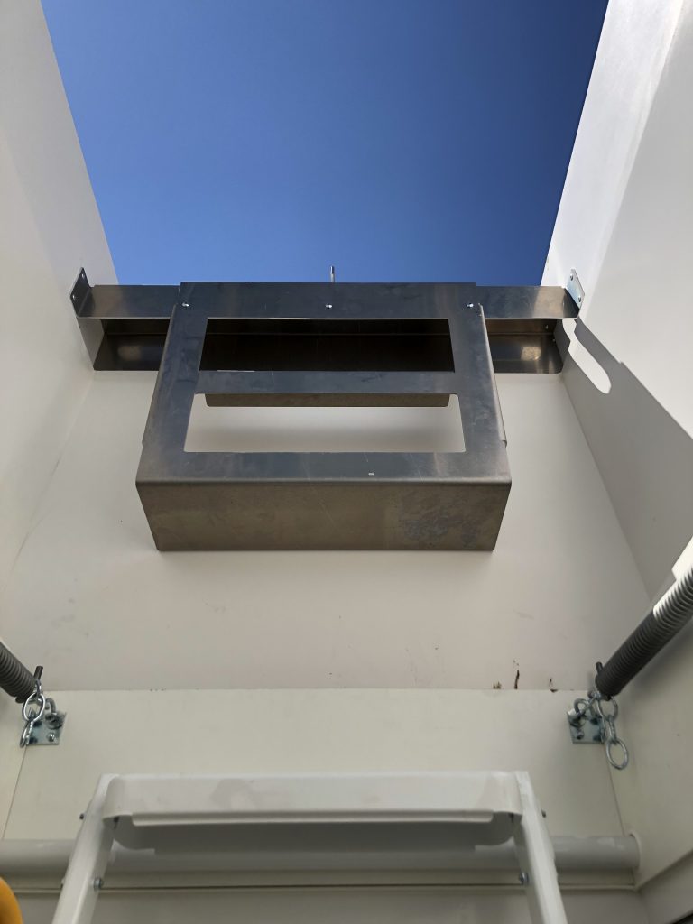 Der Dachausstieg wird direkt über dem Deckenauslass von 140 × 70 cm positioniert und mit Betonschrauben sicher fixiert. Im Inneren befinden sich zwei stabile Blechtreppen, die einen komfortablen und sicheren Aufstieg auf das Dach ermöglichen.